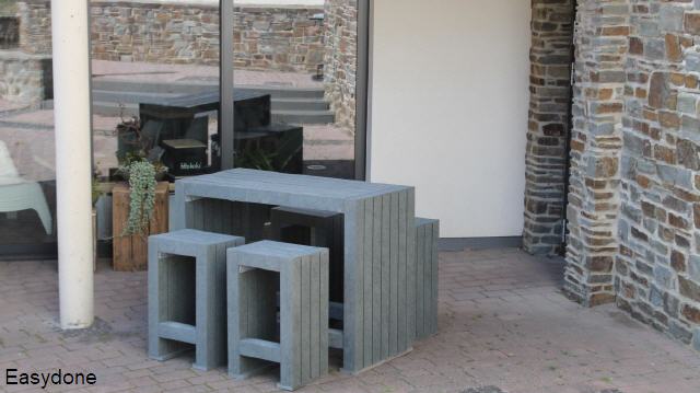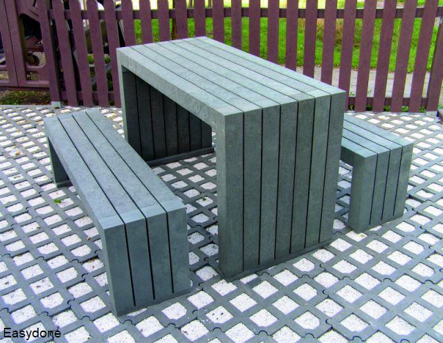 Bank -en tafel model CLO150 grijs, bank afmetingen ca. 150x40 cm (bxd), zithoogte 45 cm, gewicht ca. 70 kg en tafel afmetingen 150x67 cm (lxb), tafelhoogte 75 cm, gewicht ca. 145 kg, kleuren bruin, grijs en zwart. |