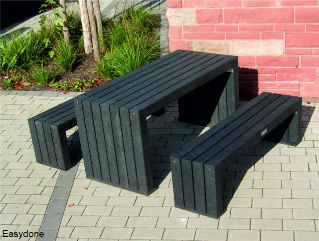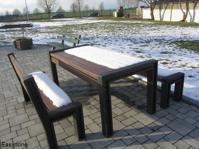 Bank -en tafel model CLO150 zwart, bank afmetingen ca. 150x40 cm (bxd), zithoogte 45 cm, gewicht ca. 70 kg en tafel afmetingen 150x67 cm (lxb), tafelhoogte 75 cm, gewicht ca. 145 kg, kleuren bruin, grijs en zwart. |