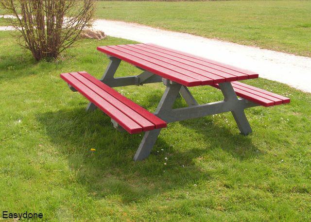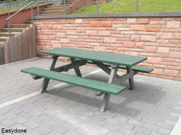Tafel/banken set model TVL200, bestaande uit tafel, bank zonder leuning en bank met leuning, afmetingen tafel 200x70x75 cm (bxdxh), gewicht tafel 112 kg, standaardkleuren bruin, groen/grijs, blauw/grijs en rood/grijs. |