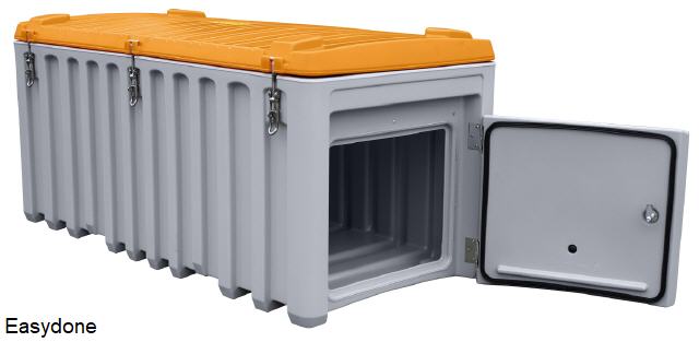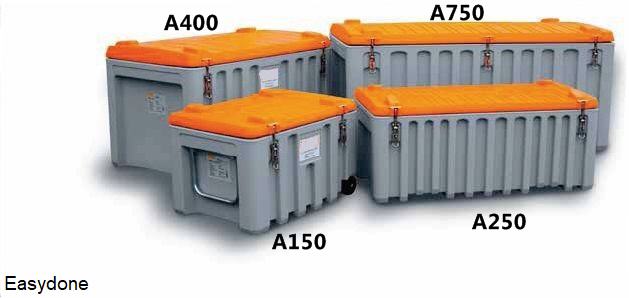 Kunststof Storagebox serie SGB, voor bijv. strooizout, zand, grid, gravel, etc., materiaal glasvezelversterkt kunststof (GFK), met schep -en palletlepel opening, UV-bestendig, regenwaterdicht, afsluitbaar met hangslot (exclusief), standaardkleuren groen/oranje en grijs/oranje, verkrijgbaar in: 200 en 400 liter inhoud. Fabrieksgarantie 10 jaar. |