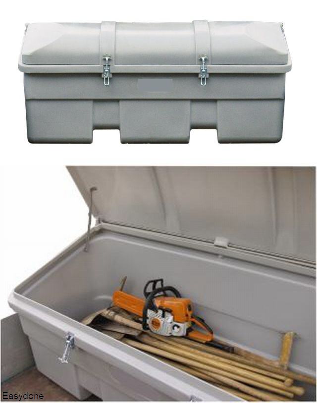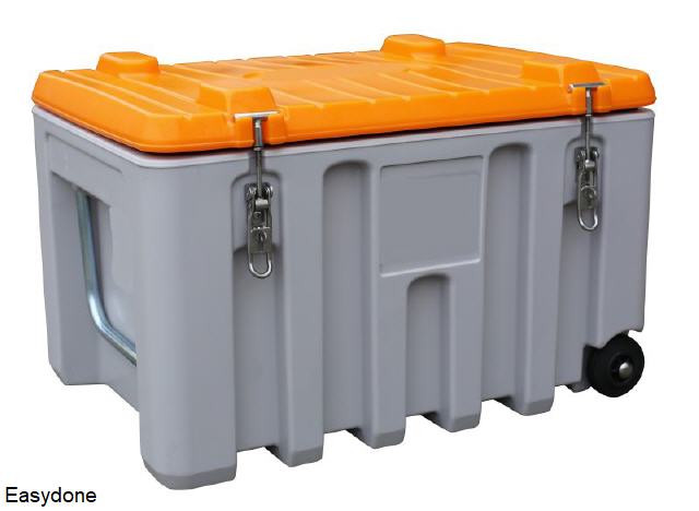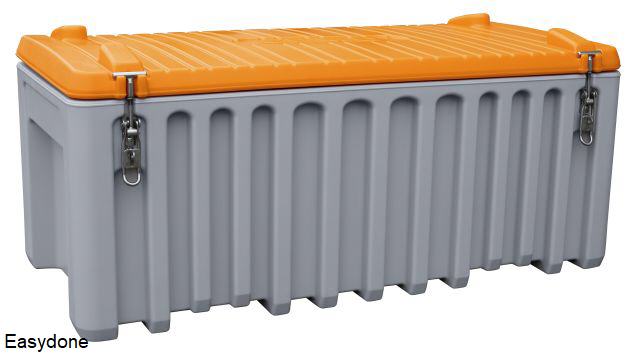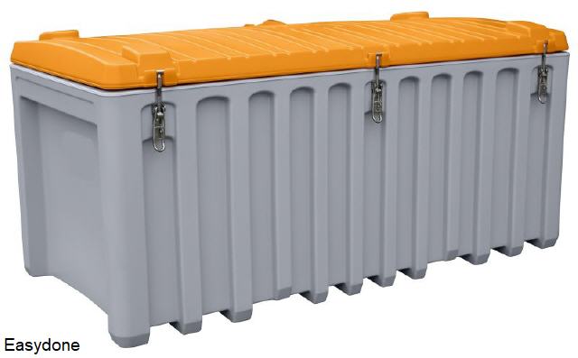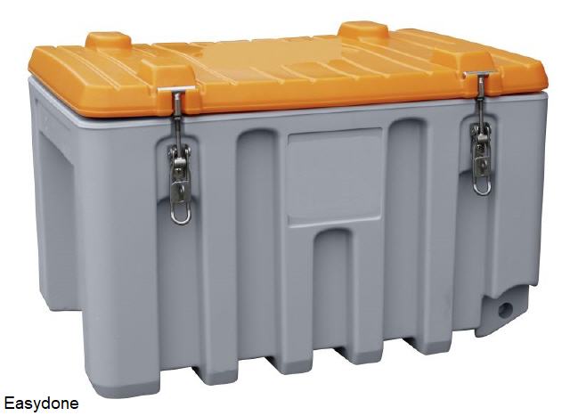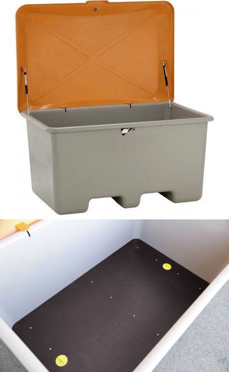 Kunststof opslagbak model KPT130, voor bijv. strooizout, zand, grid, etc., materiaal glasvezelversterkt kunststof GFK, uv-bestendig, regenwaterdicht, afsluitbaar met hangslot (exclusief), kleur grijs/oranje, verkrijgbaar in: 130 liter inhoud, buitenafmetingen 72x45x58 cm (bxdxh), 10,5 kg. Fabrieksgarantie 10 jaar. |