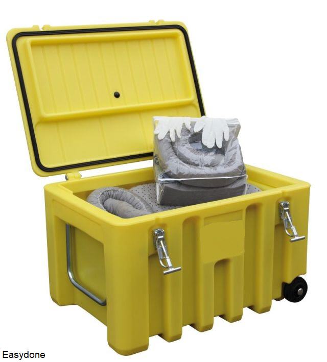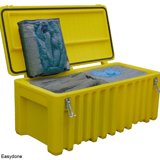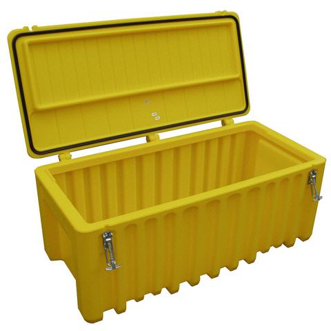 Kunststof Storage Box A250, buiten/binnenafmetingen 120x60x54/107x45x38 cm (lxbxh), gewicht ca. 18 kg, inhoud 250 liter, stapelbaar, regenwaterdicht, met handgrepen, materiaal: 100% kwalitatief recyclebaar kunststof PE (polyethyleen), standaardkleuren: grijs/oranje deksel en geel, ter afsluiting zou gebruik kunnen worden gemaakt van een hangslot (niet inbegrepen). |