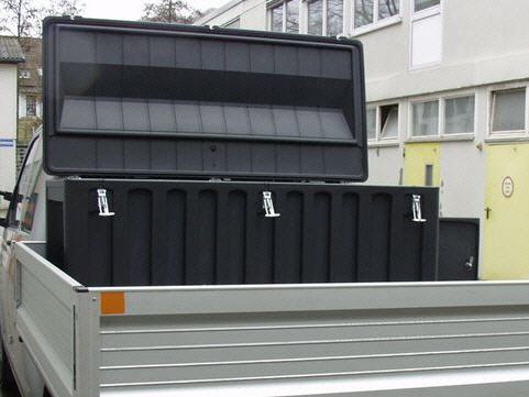 Kunststof Materiaalbox type B750, buiten/binnenafmetingen 184x74x94/171x65x50 cm (lxbxh), gewicht ca. 40 kg, inhoud 750 liter, regenwaterdicht, materiaal kunststof polyethyleen (PE), standaardkleur grijs, afsluitbaar met hangsloten (niet meegeleverd). |