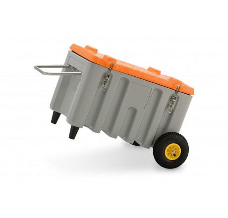 Kunststof verrijdbare container model GB70, inhoud 70 liter, voor bijv. strooizout, zand, grid, etc., materiaal polyetheen (PE), regenwaterdicht, kleur grijs/oranje, buitenafmetingen 107x59x39 cm (lxdxh), afsluitbaar en gewicht ca. 10 kg. |