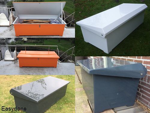 Nieuw! Polyester materiaal opbergkisten typen EL180XL en 97S, ideaal om grote tuin(lounge)kussens of ander materiaal in op te bergen, materiaal: glasvezelversterkt glad polyester, zeer sterk, weerbestendig, regenwaterdicht, stevige gladde deksel, geschikt om op te zitten of te liggen (model EL180 ligkist), inclusief bodem, onderhoudsvrij, ook in andere kleuren leverbaar (optie) en zeer lange levensduur. Optioneel verkrijgbaar: ventilatierooster, rubber sluiting, deksel steunbeugel, metalen sluiting en overige RAL kleuren.