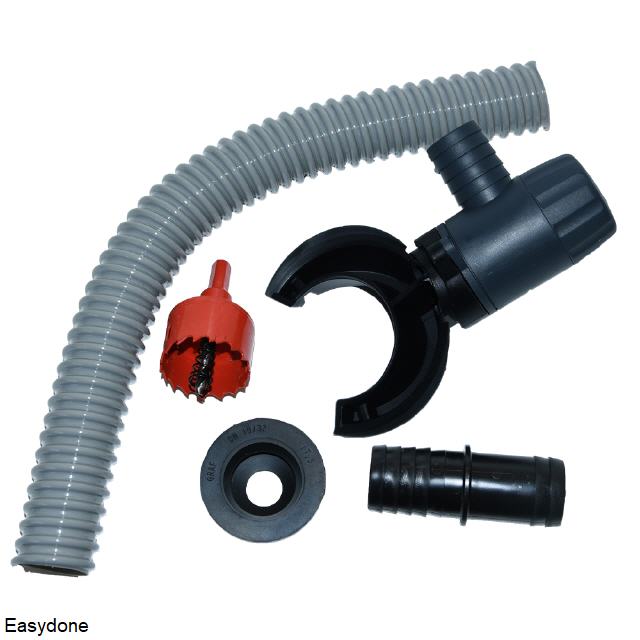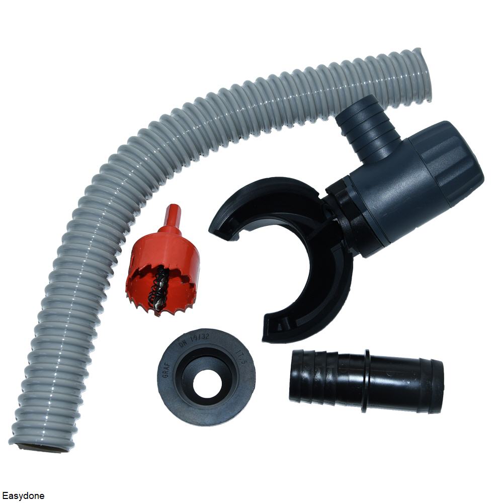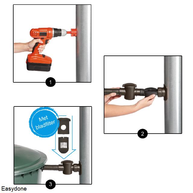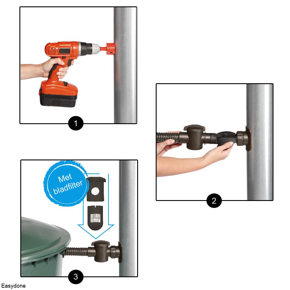Vulautomaat regenreservoir model AVI, geschikt voor snelle montage aan de regenpijp (diameter 70-100 mm) met door meegeleverde boorstuk om een gat in de regenpijp te boren en heeft overloopfunctie. |